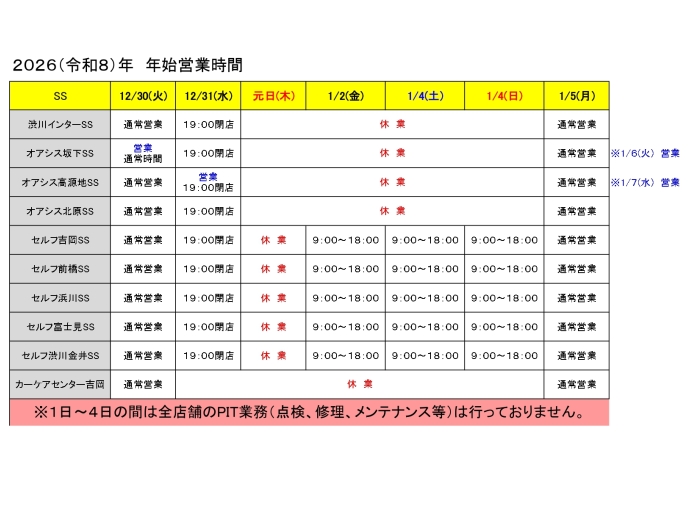 2025~2026年 年末年始 各サービスステーションの休業日及び営業時間についてお知らせいたします。